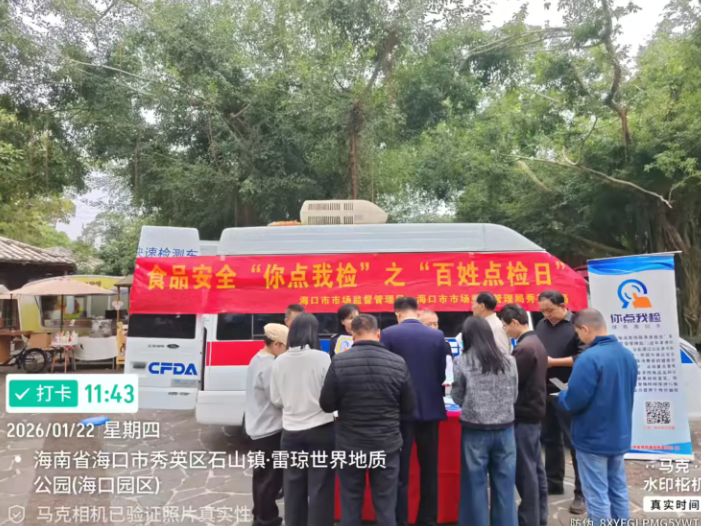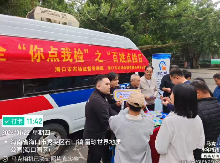 春节前夜,为进一步提拔食物抽检工做参取度,营制食物平安社会共治共享款式,2026年1月22日,海口市市场监视办理局正在区火山口地质公园开展年货购食物平安“你点我检”之“苍生点检日”宣传勾当。以“年货你点我检”为从题,场合和查验项目。