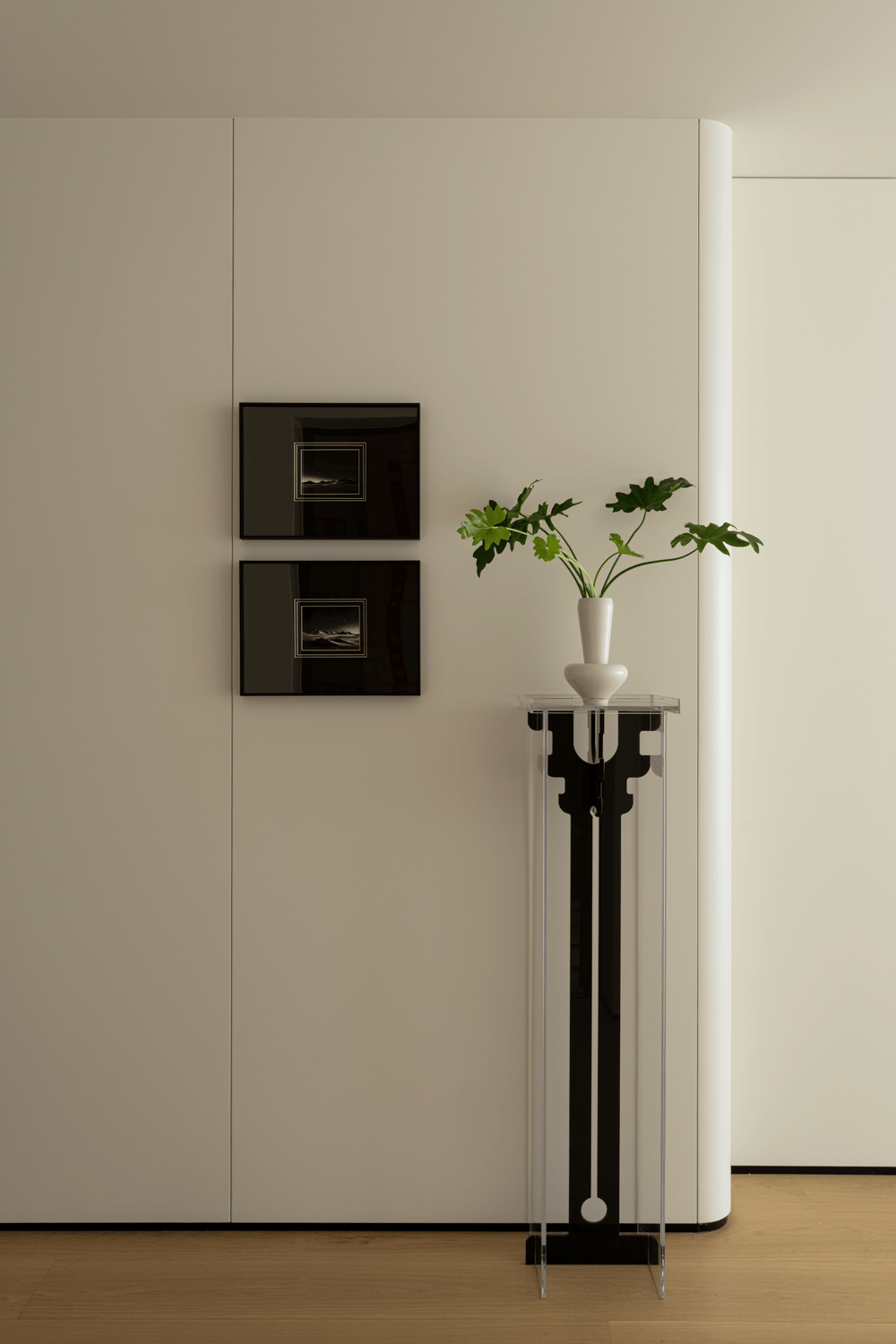 做为入户第一幕,玄关以极简姿势糊口叙事,素净墙面如天然画布。清透支架托举着素白花瓶,动物姿势调皮延展,成为毗连户外取糊口的温柔过渡。