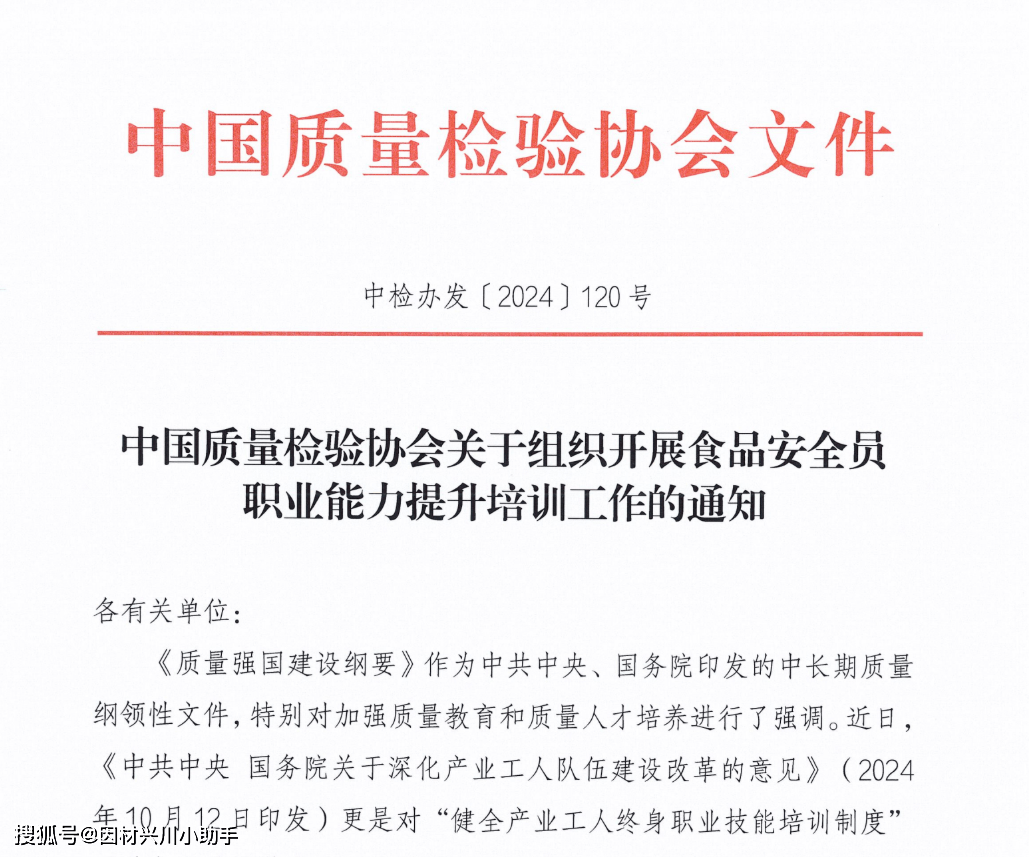 食物平安员职业前景广漠且积极。跟着社会对健康日益注沉及监管系统持续完美,食物行业对专业人才的需求持续扩大。该职业不只就业不变,笼盖出产、畅通等浩繁范畴,更具备清晰的晋升径,可向质量办理担任人等办理层成长。专业能力凸起的食物平安员价值凸显,职业成长不变而。《关于深化财产工人步队扶植的看法》(2024年10月12日印发)更是对“健全财产工人终身职业技术培训轨制”“落实企业培育财产工人的义务”“阐扬行业协会、社会培训机构感化,帮帮中小企业开展技术培训”等做出了明白摆设。按照《食物平安法》、《劳动法》等法令律例的,按关决策摆设和《企业落实食物平安从体义务监视办理》(市场监管总局令第60号)等从管部分的政策要求,为了深切贯彻落实新时代人才强国计谋,督促泛博企业和查验检测机构提拔承担质量平安从体义务的能力,引领食物平安员精确把握其职责和权限并持续提拔岗亭履责能力,持续深切贯彻落实食物平安工做“四个最严”的要求,出力阐扬质量查验行业组织正在“党委带领、从导、政策支撑、企业从体、社会参取”高技强人才工做系统中不成或缺的积极感化,合力推进质量社会共治,帮力提拔食物平安员专业素养能力和程度,指导企业加强质量工做,推进企业产物和办事质量提拔,办事高质量成长,推进质量强国扶植,中国质量查验协会组织开展食物平安员职业能力提拔培训工做。